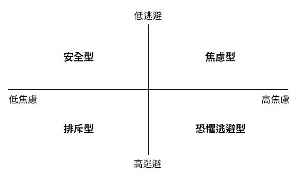 圖2.1│依照焦慮依附和逃避依附兩個向度所展現出的依附類型